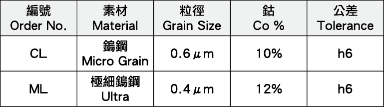 - 鎢鋼圓棒 I:選用進口高強度、高耐磨性鎢鋼材質, 具備優異的抗崩刃性與耐用性, 確保加工穩定與長效壽命。