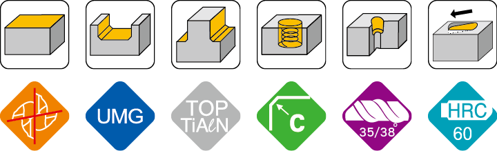 - 應用材質:碳素鋼, 十字鋼, 合金鋼, 調質鋼(≦55°HRC), 鑄鐵。