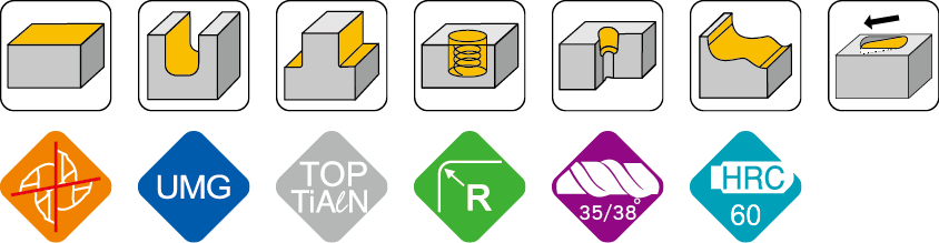 - 應用材質:碳素鋼, 十字鋼, 合金鋼, 調質鋼(≦55°HRC), 鑄鐵。