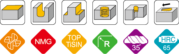 - 應用材質:十字鋼, 合金鋼, 調質鋼(≦63°HRC), 鑄鐵。