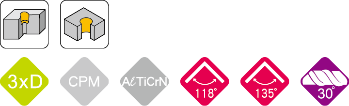 刀型設計 I:頂級粉末高速鋼搭配ALTICRN塗層, 實現了鑽頭最高性能。
