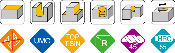 - 應用材質:碳素鋼, 十字鋼, 合金鋼, 調質鋼(≦55°HRC), 不銹鋼, 鑄鐵。